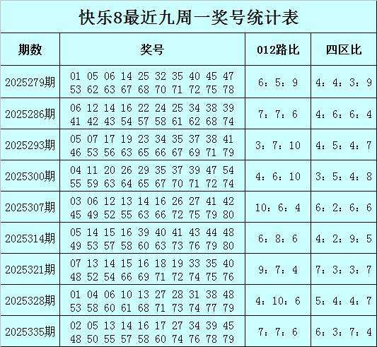 福彩快乐8第2025335期(上周一)开奖回顾:02 05 13 14 16 17 27 34 39 45 48 50 55 57 58 60 74 76 78 79,其中奖号四区比为6:3:7:4,012路比为7:7:6。