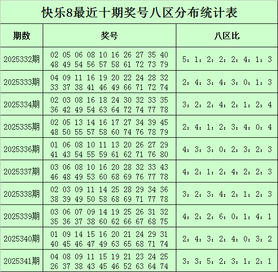 福彩快乐8第2025341期开奖回顾:04 08 09 11 15 19 21 23 24 25 26 37 38 43 45 46 52 63 64 74,其中奖号八区比为3:3:5:2:3:1:2:1。
